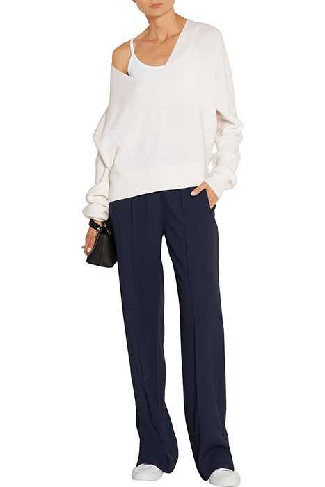 Шелковый топ на бретельках хорошо смотрится в паре с кардиганом. Комбинация актуальна для прохладной погоды. Кардиганом можно заменить классический пиджак для создания более неформального сета.