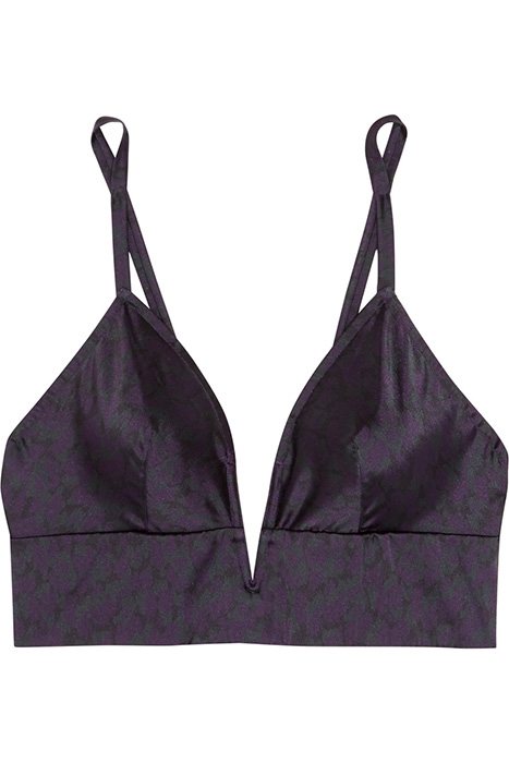 - Бархатный бюстгальтер-топ. Такая роскошная модель вполне может стать частью вечернего образа. К примеру, она будет прекрасно смотреться с атласным брючным костюмом в пижамном стиле.