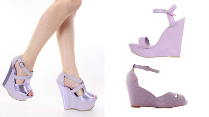 Для свободного времени идеальным выбором могут стать сиреневые туфли на танкетке, а также, босоножки и балетки, выполненные в этом цвете.