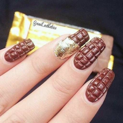 Коричневые лаки хорошо и сами по себе, но также их можно удачно использовать и воплотить в жизнь немало идей. Например, мастера по маникюру, используя шоколадные тона, создают варианты дизайна в тематике «кондитерская лавка». Капли карамели и тающего шоколада, плитки в золотистой фольге, конфеты с глазурью и без, с поливкой, с шоколадной крошкой, как из больших подарочных коробок, — чего только не придумывают для украшения ногтей.
