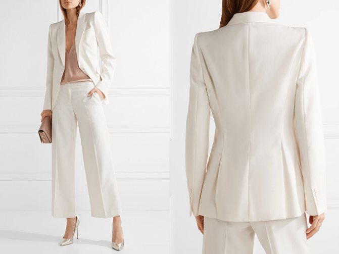 Обладательницам красивой пышной груди следует обратить внимание на безбортные модели мужского кроя с косой линией застежки. Если есть небольшой лишний вес в районе талии и живота, отдайте предпочтение расклешенному изделию средней длины. При маленьком росте рекомендуется выбирать короткий белый жакет с полоской воланов снизу.